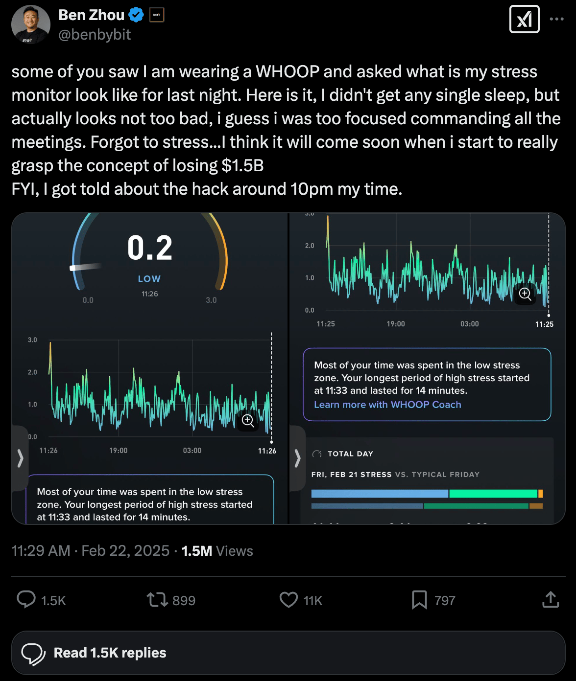 My favourite bit: Despite the gravity of the situation, Ben played it cool. The day after the breach — which he discovered at 10pm in Singapore, where he is based — he posted on X a screenshot of his fitness tracker showing normal stress levels, despite not getting any sleep. "Forgot to stress", he wrote. 😆